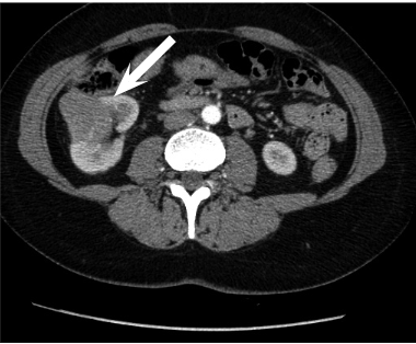 Contrast enhanced computed tomography was performed on patient as a check-up after pseudoaneurysm embolization. Scarring tissues near the lower lobe of resected right kidney and ~3 milimetres size hyperdensive lesion were found. Renal collectoric systems were not spread out. No signs of recidyves/progression of renal cell carcinoma were found.