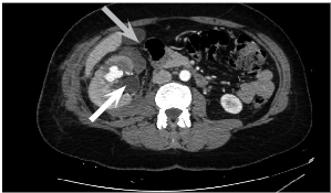 After 11 days from operation patient noticed red urine and started to feel pain in lower right abdomen. In the emergency department, patient’s examination found right hydronephrosis due to blood clot and hemathoma and hematuria with urine bladder tamponade. Laboratory tests revealed anemia (hemoglobin was 0.86 g/dL) and renal function deterioration (creatinine increased till 100 µmoL/L and eGFR was 58 mL/min/1.73 m2).