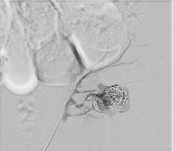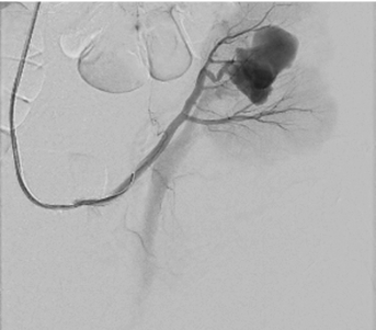 Right femoral artery was punctuated under local anesthetic. Inferior segmental artery was selectively catheterized and pseudoaneurysm was visualized. A microcatheter was inserted into segmental branch (Figure 4).