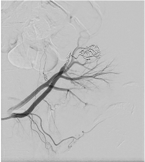 Pseudoaneurysm was embolized with two 8 mm x 20 cm coils, an additional coil of 12 mm x 30 cm (Figure 5).