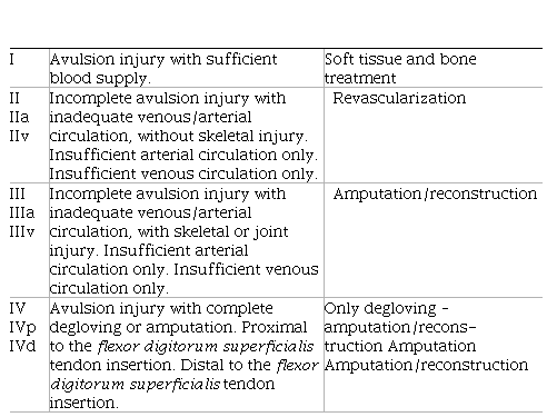 DSTI of the fingers is a particularly difficult problem to treat because of the extent of damage to the skin and subcutaneous tissue, nerves and blood vessels. The first step after identifying DSTI of the fingers is the selection of patients for replantation, as successful replantation does not always result in satisfactory preservation of finger function. For example, a non-mobile thumb replanted in an opposable position is valuable for pinching and grasping, whereas other inflexible fingers may lead to deterioration in hand function [5]. Several classification systems have been developed for more efficient treatment selection [6–8] and these systems allow patients to be categorized according to the intended treatment and functional outcome (Table 1).