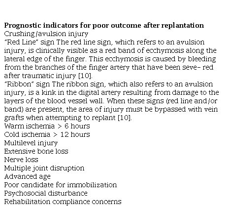 When making treatment decisions, it must be remembered that the final functional outcome is not only determined by the injury, but also by the patient’s age, health, general expectations, adherence to rehabilitation, psychosocial attitudes and other factors (Table 2)[5]. The operative treatment of each injury must be individualized, taking into account the complexity, the extent of the injury and the combination of these variables. The surgeon must emphasize that the patient must be committed to a regimen that requires rigorous rehabilitation. It is likely that the finger will become functional only 12–18 months after the injury [9]. If the patient is unable to commit to this, replantation or reconstruction becomes contraindicated.