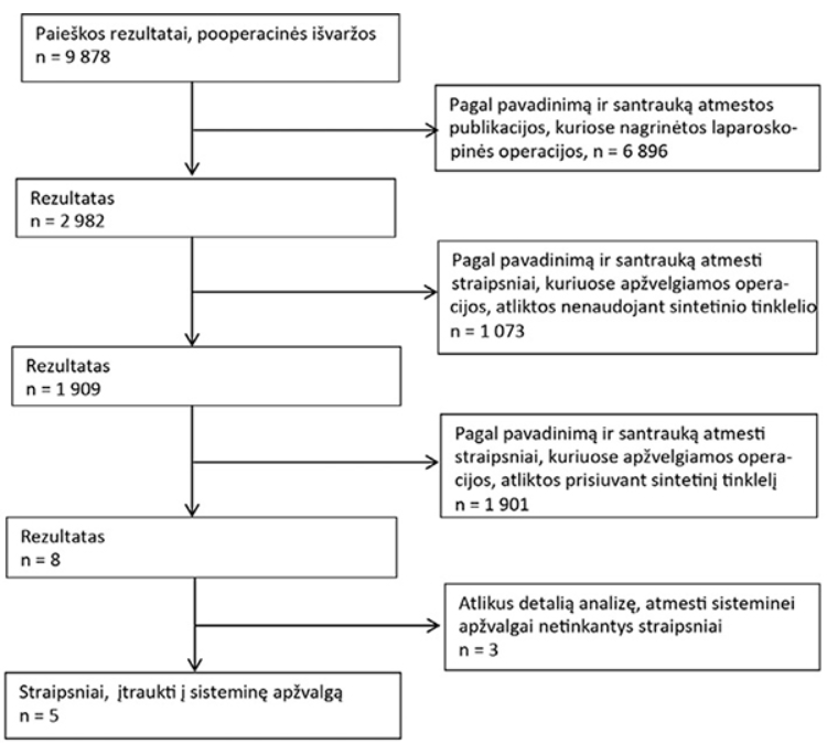 Iš viso pagal reikšminius žodžius buvo rastos 9 878 publikacijos. Atmetus straipsnius, kuriuose nagrinėtos laparoskopinės hernioplastikos ir operacijos, kurių metu nenaudotas sintetinis tinklelis, liko 1 909 literatūros šaltiniai. Atmetus straipsnius, nagrinėjančius operacijas, kurias atliekant tinklelis fiksuojamas jį prisiuvant, liko aštuoni straipsniai. Dar trijų publikacijų atsisakyta po detalios jų analizės. Taigi sisteminei analizei atrinkti ir nagrinėti penki straipsniai, atitinkantys visus atrankos kriterijus.