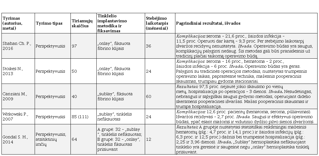 Summary: Tikslas. Apžvelgti mokslinius straipsnius, kuriuose nagrinėjama pooperacinių pilvo sienos išvaržų plastika, atliekama naudojant tinklelį, jo neprisiuvant. Metodai. Atlikta mokslinių straipsnių, publikuotų nuo 2004-01-01 iki 2018-12-31, paieška MEDLINE, PubMed ir Cochrain Library duomenų bazėse. Paieškai naudoti reikšminiai žodžiai: postoperative hernia, incisional hernia, mesh hernioplasty, sutureless repair, sutureless hernioplasty, sutureless herniotomy. Rezultatai. Į sisteminę apžvalgą įtraukti penki straipsniai. Pateikiami atliktų operacijų metodai, pagrindiniai rezultatai, išvados ir rekomendacijos. Išvados. Remiantis publikuotų straipsnių rezultatais ir išvadomis, galima teigti, kad pooperacinių pilvo sienos išvaržų operavimas naudojant tinklelį, jo neprisiuvant, yra saugus metodas, galintis pagerinti pooperacinius rezultatus. Vis dėlto patirtimi grįstos medicinos įrodymai nėra pakankami. Iki šiol nėra atlikta perspektyviųjų randomizuotų tyrimų, lyginančių „sublay“ operacijas fiksuojant sintetinį tinklelį jį prisiuvant ir jo nefiksuojant.