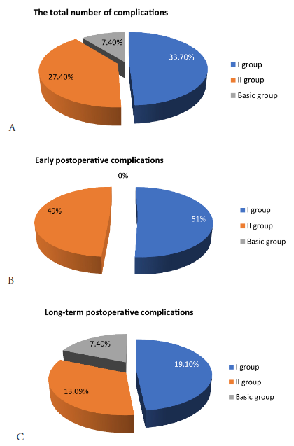 The results of treatment are indicative, taking into account all complications, including long-term periods. The total number of complications in the main group of clinical observations was 4 (7.3%), and in the first control group 30 (33.7%), in the second control group – 23 (27.4%). The proportion of complications, including those associated with subsequent recurrence of fistulas, was 4 (7.2%) in the main group. At the same time, 1 recurrent fistula later “closed” conservatively, in 3 cases, repeated surgical treatment in a hospital was required. The specific weight of complications is shown in the diagrams (Figure 4, A–C).