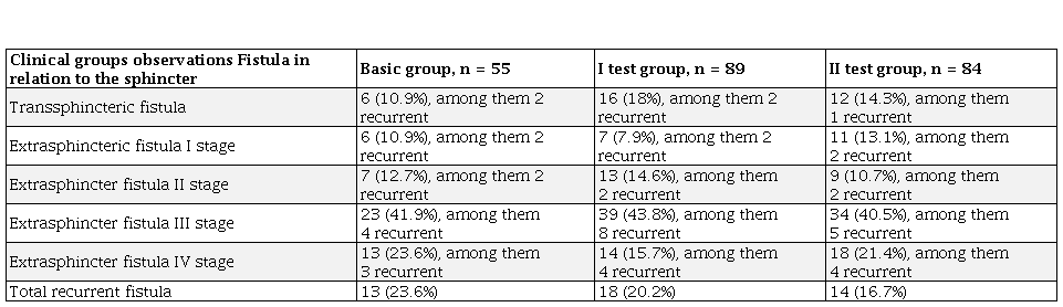 Patients with transfincter fistulas was 34 (14.9%), of them relapsing – 5 (2.2%), with extrasphincter fistulas of I degree of difficulty – 24 (10.5%), including relapsing – 6 (2.6%), extrasphincter fistulas of II stage of – 29 (12.7%), of them relapsing –6 (2.6%), extrasphincter fistulas of III stage – 96 (42.1%), of which recurrent fistulas – 17 (7.4%), extrasphincter fistulas IV stage – 45 (19.7%), of them relapsing – 11 (4.8%). 51 patients (22.4%) with a combined pathology of the anal canal that required simultaneous surgical correction. Chronic hemorrhoids of stage III–IV were detected in 21 patients (hemorrhoidectomy), chronic anal fissure in 27 patients (excision of the anal fissure, if necessary – anoplasty or dosed dilatation of the anal canal), adenomatous polyps of the anal canal – 3 observations (polypectomy).
