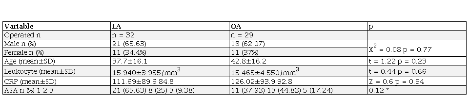 The patients were divided in two groups (laparoscopic-LA and open-OA). In terms of gender and age, the patients were presented as homogeneous groups. Male gender dominated in the two groups (65.6%, 62.1%, respectively; p = 0.77). Patients treated with laparoscopy were younger, with no significance (37.7±1.1 vs 42.8±16.2; p = 0.23). Both groups did not differ statistically in Leukocyte count (p = 0.66), CRP value (p = 0.54) and ASA classification (p = 0.12). Preoperative average values of Leukocytes were increased in both groups (15.9±3.9, 15.5±4.5, respectively). CRP presented with lower mean average values in the LA group without statistical significance (84.8 vs 92.8) (Table 1).