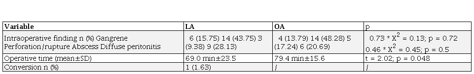 The intraoperative finding was without statistical significance in both groups. Gangrenous appendicitis and diffuse peritonitis was more common in the LA group (15.75% and 13.8%, respectively; 28.1% and 20.7%, respectively), while perforation and periappendicular abscess were more common in the OA group (48.3% and 43.75%, respectively; 17.2% and 9.4%, respectively).