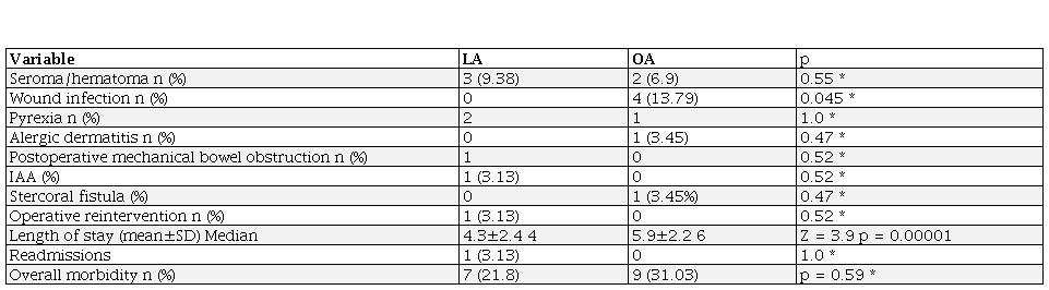 In the OA group there were 9 patients with complications (8 minor and 1 major). Wound seroma was noted in 2 patients, and wound infection occurred in 4 patients. One patient presented with allergic dermatitis. In one patient a stercoral fistula occurred and closed spontaneously without additional intervention.