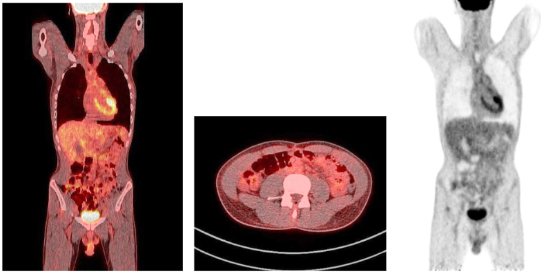 One year after the operation, a PET/ CT scan performed showed normal distribution of F-18 FDG and no signs of residual intraabdominal tumor (Figure 9). In the present period, the patient is disease free.