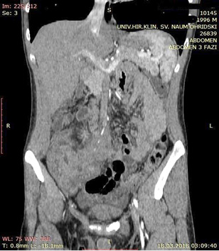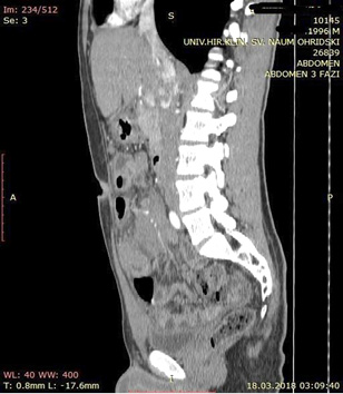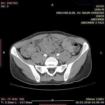 In May 2018, a 22 years old male patient presented to our emergency department of surgery with clinical signs of intestinal obstruction accompanied with abdominal pain and vomiting. On a physical examination the abdomen was slightly distended and with palpable tumor in the right medial abdominal quadrant. The blood analysis showed normal leukocyte count of 7.0x10./l with differential count for Lymphocytes 24.2%, Monocytes 13.3% and Neutrophils 62.5%. Platelets count was 447x10./l, hemoglobin level of 158.0x10./l and CRP level of 4.4 mg/l.