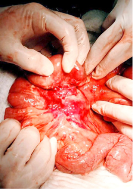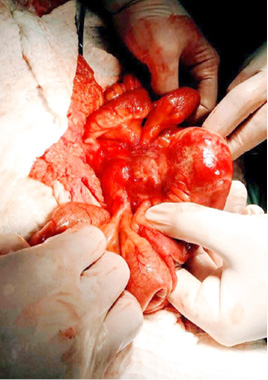 A surgical exploration was indicated the same day. During surgery, the tumor affected part of the mesentery that contains the ileocolic artery but with no vascular changes of the terminal ileum and the right colon. It was also affecting a part of the ileum wall which explained the small bowel obstruction (Figure 5, 6).