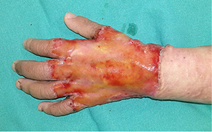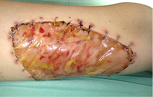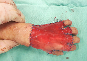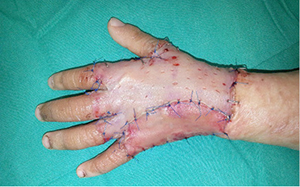 Atlikta viso apgamo ekscizija. Žaizdos dugne atidengtos fascijos, sausgyslės, raiščiai. Poodžio beveik nebuvo. Defektui užpildyti nuspręsta panaudoti dirbtinę odą Integra™. Taikyta 5x10 cm dydžio, o ne įprasta viso storio odos lopo transplantacija (pastarajai transplantacijai atlikti reikia daugiau operacijų, negu naudojant odos pakaitalą) (8 pav.). Ranka imobilizuota gipso įtvaru.