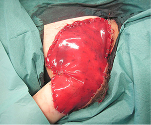 Po trijų savaičių įgyvendintas antras operacijos etapas. Pašalintas viršutinis silikoninis Integra™ sluoksnis (4 pav.) ir ant susidariusio neodermio transplantuotas skeltos (0,15 mm storio) perforuotos odos lopas (5 pav.). Pooperacinis periodas buvo sklandus, oda prigijo.