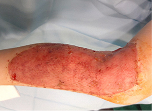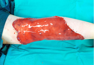 Po 15 dienų įgyvendintas antras operacijos etapas. Pašalintas silikoninis Integra™ sluoksnis (9 pav.). Susidaręs neodermis buvo gyvybingas, todėl atliktas skeltos (0,15 mm storio) odos, paimtos nuo kairės šlaunies, transplantatų persodinimas į defekto vietą (10 pav.).