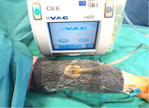 Apgamas pašalintas naudojant Integra™ odos pakaitalą (16 pav.). Taikyta vakuuminės terapijos sistema (VAC), ji buvo tęsiama 7 dienas (17 pav.). Pooperacinė eiga buvo sklandi.
