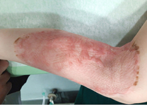 Po 2,5 savaičių įgyvendintas antras operacijos etapas. Pašalintas viršutinis silikoninis Integra™ sluoksnis ir ant susidariusio neodermio transplantuotas skeltos (0,15 mm storio) perforuotos odos lopas (18 pav.). Pooperacinis periodas buvo sklandus, be komplikacijų. Oda prigijo (19 pav.). Rezultatas – po 6 mėnesių.