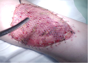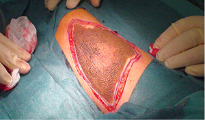 Siekiant gero rezultato, pažeisti audiniai turi būti pašalinti iki gyvybingų. Kalbamuoju atveju apgamas šalinamas kaip numatyta operacijos plane: visas iki sveikų audinių ribos arba dalimis per kelis etapus. Žaizdos dugne neturi būti gausaus kraujavimo, tačiau reikalinga kapiliarinė kraujotaka [13]. Uždengus defektą dvisluoksniu Integra™ lopu, pirmajame sluoksnyje susiformuoja neodermis ir vyksta vaskuliarizacija. Antrasis – silikoninis apsauginis – sluoksnis dažniausiai pašalinamas po 15–20 dienų ir žaizda galiausiai uždengiama plonu skeltos odos lopu [14]. Epidermio autotransplantatas turi būti maždaug 0,15 mm storio. Plonesnis (0,1 mm storio) gali neprigyti dėl nepakankamo pamatinės membranos kiekio, o storesnis (0,2 mm storio) gali sukelti stipresnį randėjimą. Dažniausios komplikacijos: hematoma, skysčių sankaupa, infekcija ir pernelyg ankstyvas ar vėlyvas silikoninio sluoksnio atsiskyrimas [13]. Norint reikšmingai sumažinti komplikacijų riziką, būtina tinkamai transplantuoti odos pakaitalą ir atidžiai stebėti pacientą po operacijos: žaizdas tikrinti kas 48 val., greitai ir atitinkamai reaguoti įtarus minėtas komplikacijas.