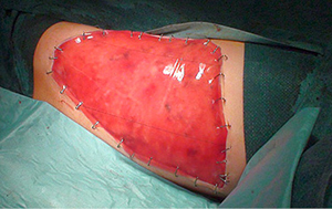Pirmas operacijos etapas – apgamo ekscizija sveikų audinių ribose (2 pav.). Į defekto vietą persodintas sintetinio odos pakaitalo Integra™ 10×12,5 cm dydžio lopas (3 pav.). Pritaikyta vakuuminės terapijos sistema, kuri buvo tęsiama 7 dienas.