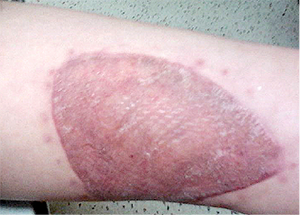 Pacientė (amžius – 6 m.) kreipėsi į Vaikų ligoninę dėl pigmentinio apgamo šlaunies srityje. Apžiūrėtas didelių matmenų (7×11 cm (M1) dydžio) įgimtas pigmentinis apgamas dešinės šlaunies priekiniame vidiniame paviršiuje. Apgamas grublėtas, padengtas plaukais (1 pav.). Nuspręsta pašalinti visą apgamą ir pirmą kartą Lietuvoje didelį odos defektą padengti dirbtine oda Integra™. Siekiant odos pakaitalą geriau prispausti prie žaizdos dugno ir eksudatui drenuoti taikyta vakuuminė terapija.