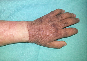 Pacientas (amžius – 2 m. 8 mėn.) kreipėsi į Vaikų ligoninę dėl didelio pigmentinio apgamo plaštakos srityje. Apžiūros metu buvo matyti įgimtas grublėtas pigmentinis apgamas (8×7,5 cm (M1) dydžio), apimantis kairės plaštakos ir I–V pirštų nugarinius paviršius, ir žiedinis randas aplink riešą ir distalinę dilbio dalį (7 pav.). Žinoma, kad anksčiau šioje vietoje buvo pašalinta įgimto apgamo dalis ir transplantuotas viso storio odos lopas.