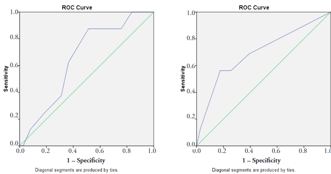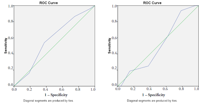 ROC analysis for prediction of delayed appendectomy showed that the surface area below the ROC curve for the Alvarado score was 0.577, with a sensitivity of 54% and a specificity of 62%; for the RIPASA score the value was 0.651, with a sensitivity of 62.5% and a specificity of 63.5%, and for the Tzanakis score the value was 0.696, with a sensitivity of 69% and a specificity of 60.8%. Regarding the AIR score, the ROC analysis showed that the size of the area under the ROC curve was 0.504, so this scoring system was not useful in isolating patients with delayed and timely appendectomy (Table 5, Figures 1 and 2).