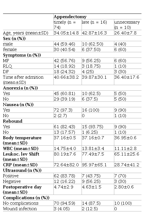 Limiting factors in our study are the following: (a) the relatively small size of the sample despite the potential nature of the study and (b) the different physicians who decided on an appendectomy for different cases.