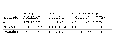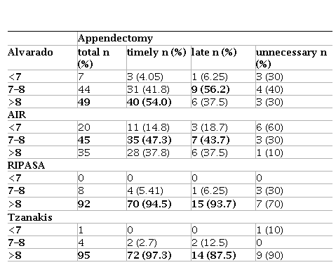This study aimed to assess the diagnostic accuracy (specificity and sensitivity) of Alvarado, AIR, Tzanakis and RIPASA scores for assessment of timely, delayed or unnecessary appendectomy and ROC analysis for prediction of delayed appendectomy.