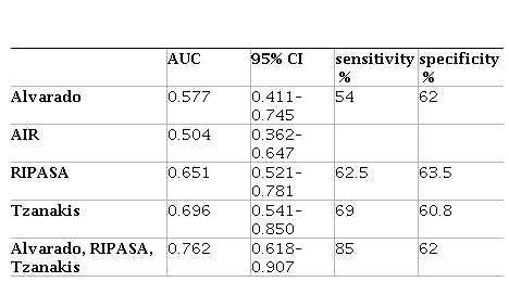 In our study about the use of each of the scoring systems, except of AIR, we obtained values of sensitivity and specificity that were lower than those presented in the literature, and using them individually we concluded that they were not sufficient for complete diagnosis and surgical treatment. But, when combining the three scoring systems (Alvarado, RIPASA, and Tzanakis), the size of the surface under the ROC curve had a value of 0.762, with a sensitivity of 85% and a specificity of 62. This suggests the conclusion that simultaneous application of the three scoring systems, Alvarado, RIPASA, and Tzanakis, has a good discriminatory ability in isolating patients with delayed and timely appendectomy.