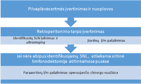 Daug metų, siekiant nustatyti stadiją chirurginiu būdu, buvo atliekama histerektomija kartu su sistemine limfonodektomija. Tačiau sisteminė limfonodektomija siejama su didesniu pooperacinių komplikacijų, tokių kaip pooperacinės žaizdos infekcija, komplikuotos limfocistos susiformavimas, kojų limfedema, skaičiumi, be to, ji nepagerina ligonių išgyvenamumo rodiklių [5, 7 – 9]. 2011 m. ir 2017 m. atlikti atsitiktinių imčių klinikiniai tyrimai, kuriuose lygintos dvi grupės moterų, sergančių UC EV: vienai grupei atlikta histerektomija su sistemine dubens limfonodektomija, kitai grupei – tik histerektomija. Sisteminė limfonodektomija nepagerino ligonių bendrojo išgyvenamumo ir nepailgino laiko iki ligos atkryčio [10, 11].