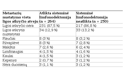 Klinikinės ir patologinės tiriamų grupių charakteristikos pateikiamos 2 lentelėje. SL identifikuotas 34 pacientėms iš 35 (97,1 %). SL abiejose dubens pusėse identifikuotas 30 iš 35 pacienčių (85,7 %). Tiriamųjų, kurioms atlikta sisteminė dubens limfonodektomija, grupėje nė vienai pacientei nebuvo nustatyta metastazių sritiniuose limfmazgiuose, o grupėje, kurioje tirtas SL, metastazių aptikta dviem (5,7 %) pacientėms; jų navikų