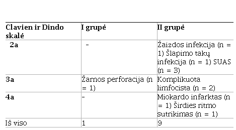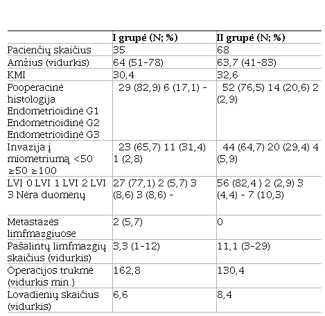 charakteristika atitiko: pT1aN1M0G1 LVI2 ir pT1bN1M0G1 LVI0. Pacienčių, kurioms tirtas SL, grupėje nustatytas statistiškai reikšmingas (p 0,05) mažesnis pooperacinių komplikacijų dažnis – 3,8 proc., palyginti su grupe, kuriai buvo atlikta atviroji operacija (13 %) (3 lentelė). Priešoperacinės endometro biopsijos rezultatai nesutapo su galutiniu histologiniu tyrimu (naviko diferenciacijos laipsnis) 28 moterims iš 103 (27 %). Kliniškai nustatyta FIGO I ligos stadija po operacijos pasikeitė į didesnę 9 iš 103 moterų (8,7 %): 4 pacientėms (11,4 %) I grupėje (dvi makrometastazės SL ir dvi dėl lokalaus naviko išplitimo) ir 5 pacientėms (7,3 %) II grupėje (visoms dėl lokalaus naviko išplitimo). Adjuvantinis gydymas I grupėje skirtas 40 proc. (n = 14) atvejų, II grupėje – 30,8 proc. (n = 21) atvejų. Apibendrinant NVI patirtį, galima teigti, kad SL ir minimaliai invazyvi chirurgija turi ryškų pranašumą tiek nustatant metastazes limfmazgiuose, tiek pooperacinių komplikacijų kontekste.