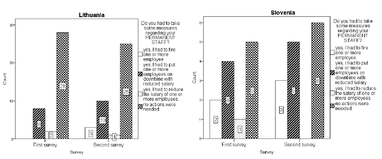 In August, some statistically significant (Z =-2.1, p=0.038) changes were noticed in Lithuania regarding permanent staff – in August, more respondents answered they had to put one or more employees on downtime with a reduced salary or even dismiss one or more employees. There was no statistically significant (Z =-0.4, p=1.000) changes regarding the permanent staff in Slovenia after three months (Fig. 9).