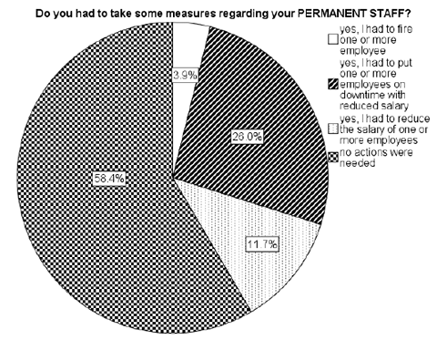 More than half (58.4%) of respondents from all four countries reported that no actions were needed regarding their permanent staff in May 2020. The worst situation was in Iceland, where almost half of respondents had to put one or more employees on downtime with reduced salaries, reduce the salaries or had to dismiss one or more employee. Slovakia was less affected as just two respondents (of 11) reported that they had to reduce the salary of one or more employees.