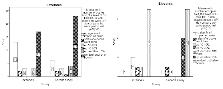 Results revealed that the publishing of e-books might depend on the population of a country – the largest proportion of e-book publishers (55.3%) was found in Lithuania and Slovakia (54.5%), two countries with the largest population in survey. The largest growth of e-book sales took place in Slovakia and Slovenia, where most respondents reported an increase in e-book sales. Respondents from Lithuania and Iceland reported mostly no impact on sales or just slightly increased sales. In August, the situation with e-book sales improved in Lithuania, but remained more or less the same in Slovenia.