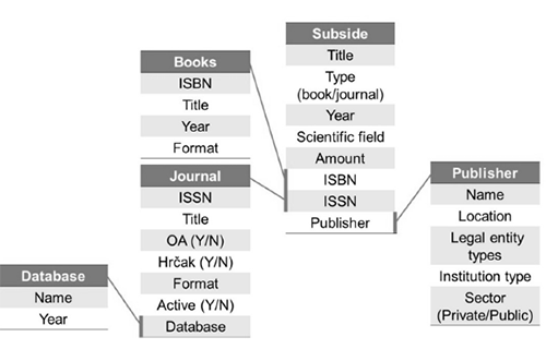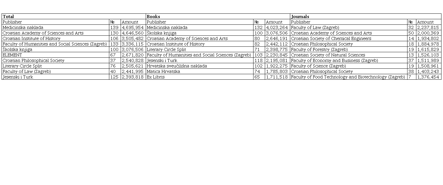 The Croatian academic publishing ecosystem extensively depends on subsidies which the Ministry of Sciences and Education every year, according to results of public call submissions and according to designated criteria, grants both to privately owned publishing houses and to educational and scientific institutions that publish academic monographs and/or journals. Reports on granted subsidies for both journals and books are available in clearly structured documents,2 providing data about publisher, author or editor, publication title, and granted finances, meaning that they offer possibility to analyze and reconstruct the scope of national academic book and journal publishing, participation of institutions and publishers, included scientific fields and disciplines, quality and visibility of output, and invested financial means. In other words, such analyses contributes to the understanding of the national academic publishing landscape in general.