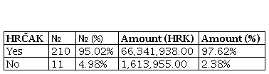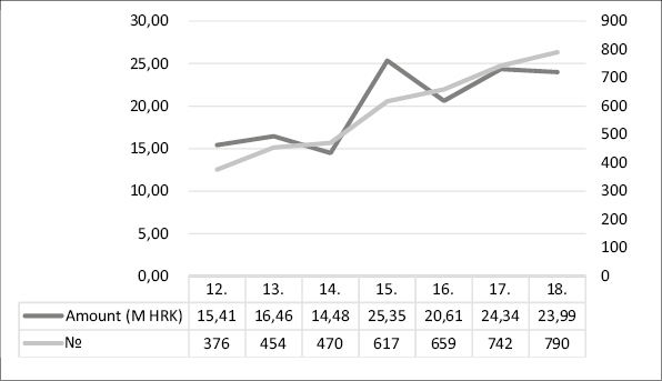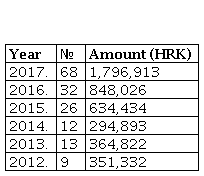 The analyses revealed that the number of subsidies rose steadily from 2012 to 2018, as shown in Graph 1. It has more than doubled in that time, from 376 subsidies in 2012 to 790 subsidies in 2018. The increase in the total amount of subsidies was not as linear. There was a significant increase in 2015 when more than 25 million HRK was granted, compared to only 14.48 million the year before. That amount stagnated or slightly decreased in the following years. The result of steady rise in seven years on one hand, and decrease in total amount granted on the other, is cut in average subsidy granted to 30,372 HRK in 2018, from 40,971 HRK in 2012 (see Table 1).