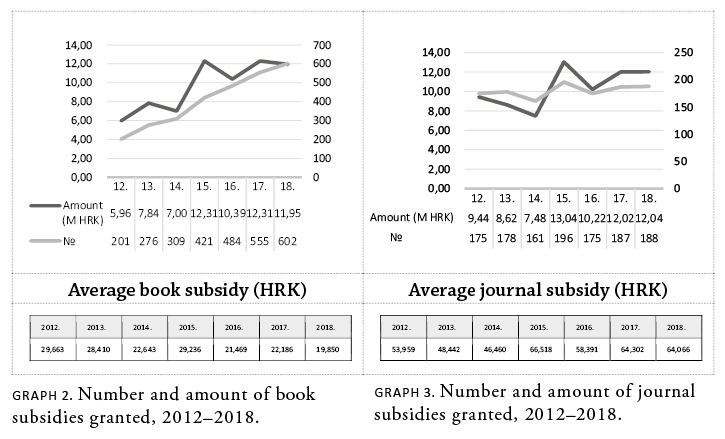 The first three trends are interconnected and need to be discussed in more detail. Compared to the findings of Siniša Zrinščak and Marija Tomečak, subsidies totals for both journals and books during the period considered in this paper were cut down by approximately 50% compared to the period from 2001 to 2008 (with the exception of 2004), when grants amounted to more than 40 million HRK.26 A steady growth, visible in this research, has started after the period of 2010-2012, when book subsidies dropped to a minimum of circa 5 million HRK per year, and journal subsidies to 8-9 million HRK. From 2013, the amount of subsidies has steadily risen and was almost equal for journals and books, but as the number of supported journals remained almost the same, and the number of books tripled, the distribution of grants per individual project significantly changed. For journals, it slowly rose, and for books, it was cut down by one third.