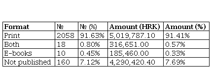Regardless of the mentioned deficits, any discussion on academic publishing in Croatia and about the model of subsidies considered in this paper should result in a final and very simple conclusion: regarding the size of the market, the underdeveloped marketing and sales policies for academic publications in Croatia, the purchasing power of a considerable group of individual buyers targeted by academic publishers (students), and other similar circumstances, the supply-side model sustained by the Ministry of Science and Education makes at all possible an overwhelming majority of publishing projects in the field of national academic publishing.