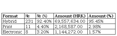 The results are very different for journal formats. Most of the journal subsidies were granted to hybrid journals. A total of 231 hybrid journals received 95.45% of the amount of journal subsides. The rest was divided between 11 print and 8 electronic journals. Print journals received 2.98% and electronic just 1.57% of the total amount of subsidies, as presented in Table 11. This indicates that Croatian academic journal publishers have almost entirely adopted electronic publishing, but very few have abandoned classical, print editions.