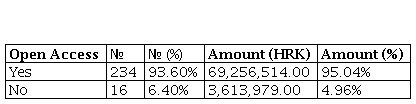 A large share of subsidies was granted to journals in Open Access. A total of 234 journals (93.60%) were granted 95.04% of the total amount of subsidies. Data are shown in Table 12. That is not unexpected since one of the criteria for receiving a subsidy is journal availability in Open Access. Also, as explained above, journals should be available in HRČAK, the central portal of Croatian scholarly journals. A total number of 210 subsidized journals are available in HRČAK, and they received as much as 97.62% of total journal subsides. Only 11 subsidized journals are not available there. Data on availability in HRČAK are shown in Table 13. Popular science journals are not included in the analysis since HRČAK is intended for archiving only scholarly journals.
