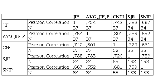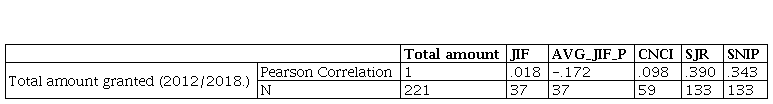 While the indexed journals received, on average, a larger subsidy, another analysis was conducted to determine whether there is a correlation between the total amount of subsidies granted and the journal’s impact. The correlation is a measure that can be used in cost/impact analysis.18 The amount granted to specific journals from 2012 to 2018 was calculated and compared to its bibliometric indicator scores in 2018. Five different indicators were chosen. Journal Impact Factor (JIF),19 Average Journal Impact Factor Percentile,20 and Category Normalized Citation Impact (CNCI)21 are based on the Clarivate Analytics Web of Science database. SCImago Journal Rank (SJR),22 and Source Normalized Impact per Paper (SNIP)23 are based on Elsevier’s Scopus database. The Pearson Correlation was calculated in SPSS, and the results are shown in Table 15. Only for journals indexed in the mentioned databases could the correlation be calculated. The results clearly show that there is no significant correlation between the amount granted to journals and indicators based on the Web of Science database. There is also just a low positive correlation with indicators based on Scopus. At the same time, there are moderate-to-high correlations between the indicators, as visible from Table 16.
