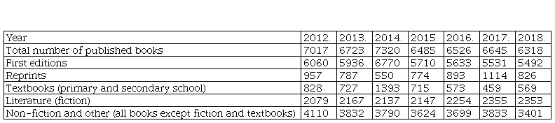 According to available data, the proportion of publishing projects subsidized by the Ministry of Science and Education in total number of academic books published in Croatia cannot be exactly determined, as no statistics provides such a data. Lobel Machala, head of the bibliographical department in the National and University Library in Zagreb, kindly assisted this research by offering unpublshed data about the total book publishing output during the time span covered here (See table 18). The data gives the total number of published books, ratio of first editions and reprints, and total numbers for fiction, school textbooks and everything else, meaning all books except fiction and textbooks. Academic books and university textbooks belong to the last category, but how many of them is there compared to the plentitude of children and adults’ non-fiction is impossible to determine.