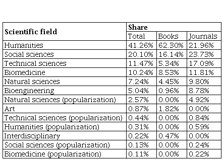 Second, as the number of subsidies for journals have remained roughly the same, while the total granted amount somewhat increased (for circa 8 percent in 7 years, but in a rather zig-zag-like graph), it could not be said that Croatian academic publishing, as promoted by the heading national scholarly and academic institution, contributes to and witnesses the proclaimed age of the journals.28 Monographs still play a considerable role in scholarly communication, and are in no case regarded inferior to journals. They received roughly the same total amounts of subsidies, and, as aforementioned, the number of projects tripled in seven years. An overview across scientific disciplines shows that books are a superior form of communication in the humanities (62.30% of all projects), while in the technical sciences, natural sciences, and particularly in bioengineering, the predominant scholarly medium is the journal. Regarding social sciences, 16.14% of subsidies goes to books, and 23,73% to journals, meaning that the last are dominant, but not in such a significant proportion. Some recent research also negate the perceived crisis of scholarly monographs: “[…] figures gathered from Cambridge University Press, Oxford University Press, Routledge, and Palgrave all showed ‘very significant growth’ in the numbers of new monographs being published (Crossick 2015: 21). Sales may be dropping, but there are new types of publication and new kinds of production which means the number of ways books are being consumed and found is increasing rapidly.”29