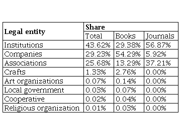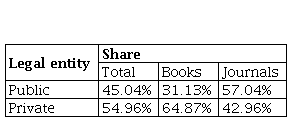 Regarding sectors, the results showed that the private sector received 54.96% of total subsidies, while the rest was granted to public institutions. Again, there are differences between book and journal publishers. The share granted to privately owned book publishers rises to 67.87%, while they received 42.96% of journal subsidies. Shares by publishing sectors are visible in Table 5.