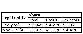 When the results of two previous analyses are combined, differences between shares of subsidies granted to for-profit and non-profit publishers can be analyzed. For this analysis, for-profit publishers were defined as privately owned legal entities registered as companies, crafts, or cooperatives. Those types of publishers received 29.04% of total subsidies in the analyzed period, as visible in Table 6. The difference between book and journal publishers is also visible in this regard. For-profit book publishers received 54.23% of subsidies, while for-profit journal publishers received only 5.60%. These results indicate that for-profit publishers play a significant role in Croatian academic book publishing but are almost insignificant in the academic journal publishing sector.