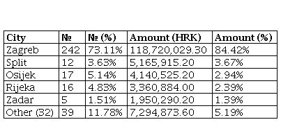 The results also showed that most of the subsidies were granted to publishers registered in Zagreb, the Croatian capital; 242 publishers with headquarters in Zagreb (73.11%) are granted as much as 84.42% of the total amount of subsidies. They are followed by publishers from Croatia’s largest centers: Split, Osijek, Rijeka, and Zadar (see Table 8). That results indicate that the Croatian academic publishing market is highly centralized, and that the publishing activity is concentrated in the country’s capital.