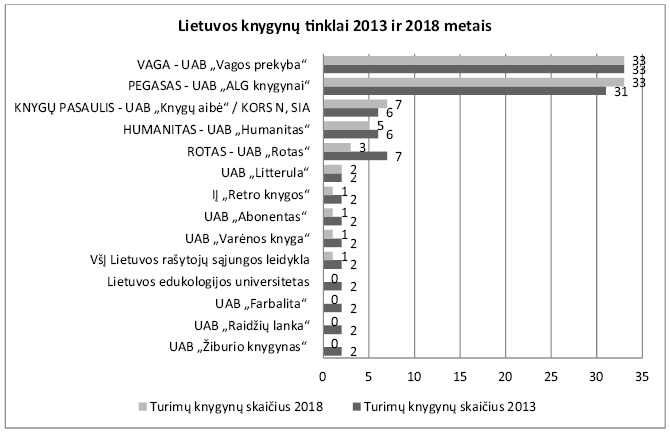 Didžiausi Lietuvos knygynų tinklai išliko tie patys: „Vaga“ ir „Pegasas“, turėję po 33 knygynus 2018 metų pabaigoje. Nors vieni šių tinklų knygynai buvo uždaryti, kiti atidaryti, iš esmės abiejų tinklų knygynų skaičius menkai kinta nuo 2008 metų. Tikėtina, kad iki tol vykusį spartų šių tinklų augimą pristabdė ir tuo metu prasidėjusi pasaulinė ekonomikos krizė. Mažėjo ir vidutinių knygynų tinklų: „Humanitas“ uždarė vieną knygyną ir liko su penkiais, „Knygų aibės“ knygynų tinklą perėmė kitas savininkas ir padidino knygynų skaičių iki septynių, „Rotas“ uždarė keturis knygynus ir liko su trimis, taip persikeldamas į mažų knygynų tinklų kategoriją. 2013–2018 metais labiausiai sumažėjo mažų knygynų tinklų (turintys 2–3 knygynus). Iš devynių mažų knygynų tinklų, kuriems 2013 metais priklausė po du knygynus, išliko tik „Litterula“, visi kiti uždarė arba po vieną, arba ir abu savo turėtus knygynus. Tokie pasikeitimai rodo, kad du didieji knygynų tinklai „Vaga“ ir „Pegasas“ sustiprino savo padėtį rinkoje. Skaičiuojant pagal knygynų skaičių, 2018 metais jie jau turėjo 39 proc. rinkos. Nėra viešai prieinamų duomenų apie knygynų ar jų tinklų pajamas, tačiau vertinant apibendrintus visų knygų prekybos rinkos dalyvių duomenis matyti, kad nuo 2013 metų pajamos nežymiai augo ir 2018 metais siekė beveik 32 mln. eurų.
