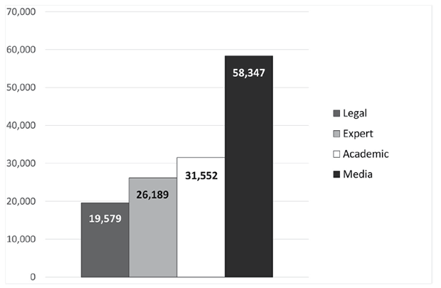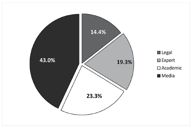 The distribution of different genres in the corpus was mainly determined by the accessibility of CS texts; therefore, media articles, which are most accessible, constitute the most significant part of the corpus (43.0%). The subcorpora containing texts of specialised discourses (legal texts, expert texts, academic texts) are considerably smaller, but their size was sufficient for comparative analysis of the data.