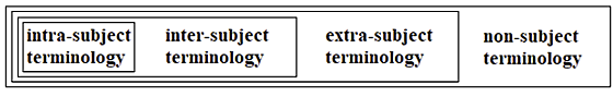 In addition, in term recognition processes, it is important to consider that “a term candidate can be associated to a domain to different degrees” (Hätty, Schulte im Walde, 2018). Roelcke (1999) groups terms into four layers: intra-subject terminology specific to the focus domain, inter-subject terminology specific both to the focus domain and other domains, extra-subject terminology not specific to the focus domain but used within it and non-subject terminology, which is shared across all specific domains (Roelcke, 1999 as cited in Hätty et al., 2017). This classification is presented in Figure 1.